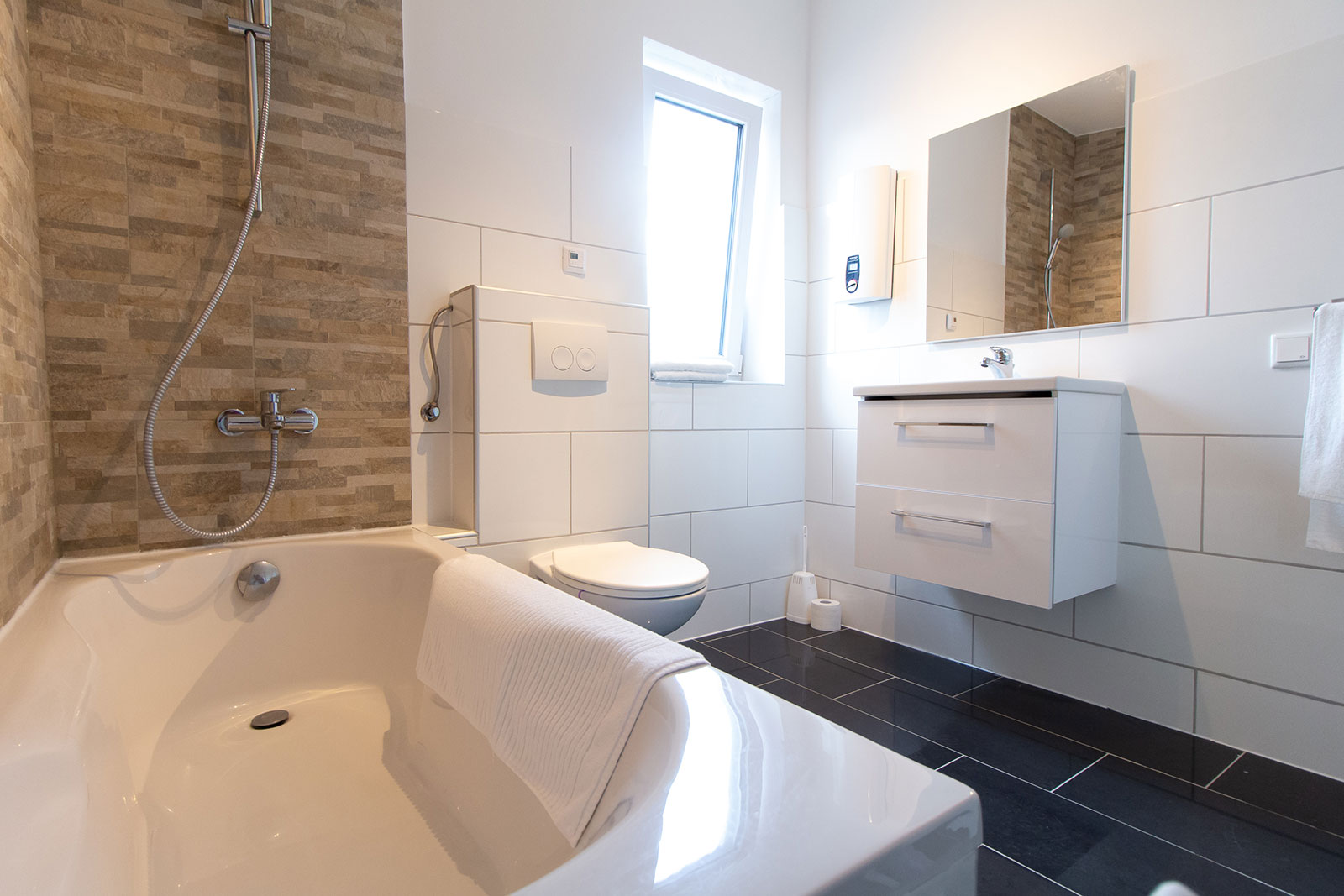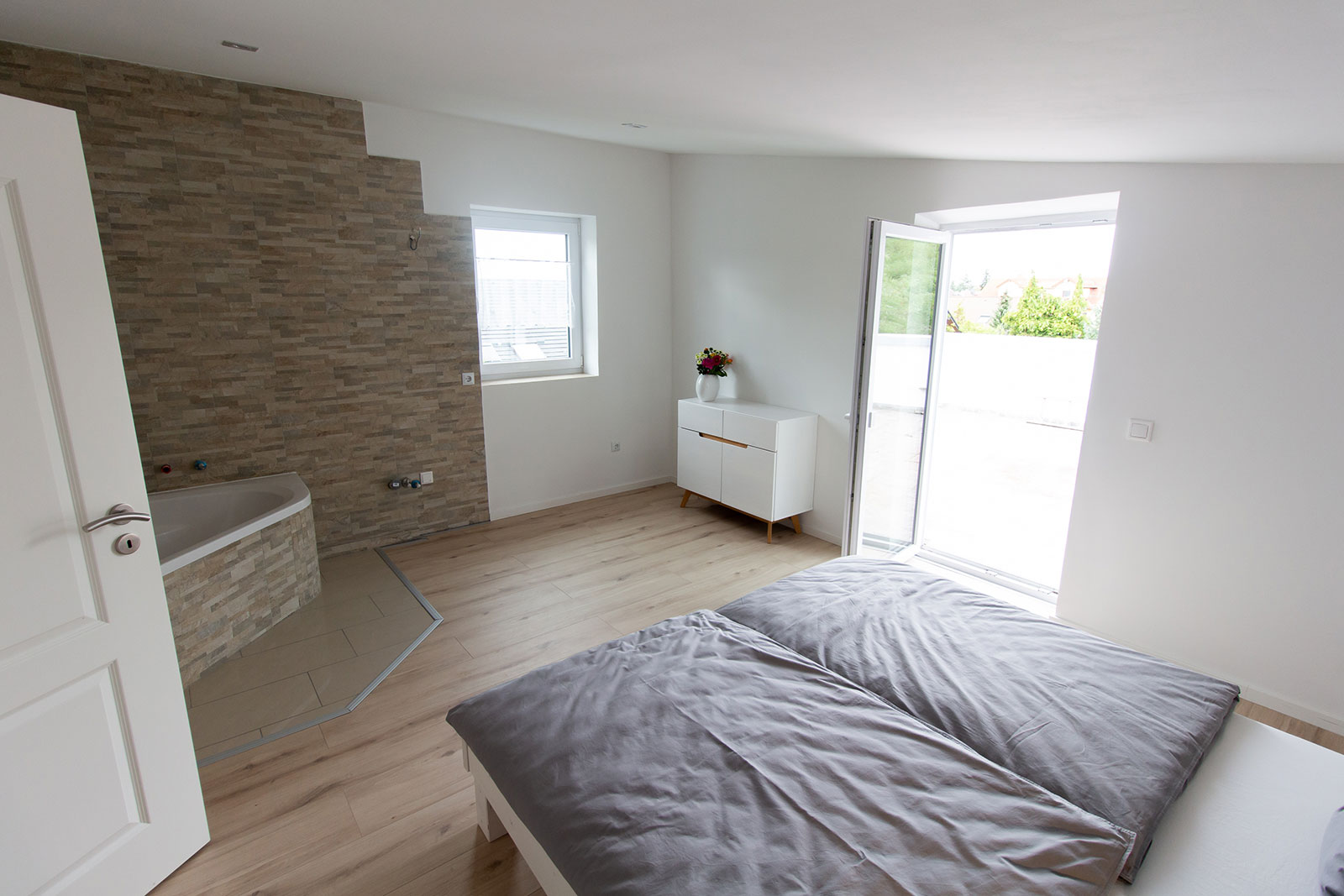 Das Highlight dieses Raumes ist die Eckbadewanne für ein erholsames Entspannungsbad. Sie haben einen direkten Zugang auf die Dachterrasse, die einen herrlichen Ausblick auf Wald und Garten bietet.