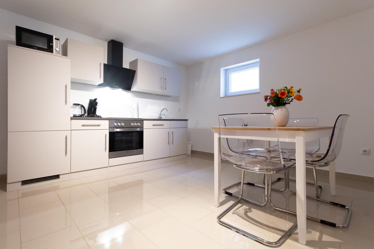 Der Wohn- und Essbereich bildet eine Einheit mit moderner Einrichtung und gut ausgestatteter Küche. Die moderne und hochwertige Küche ist vollständig ausgestattet (inkl. Mikrowelle, Spülmaschine, Toaster, Wasserkocher und Kaffeemaschine).